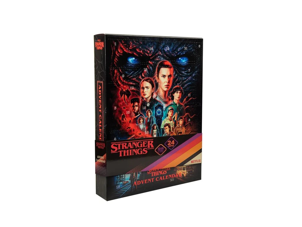 Advetní kalendář Stranger Things obsahuje 24 dárků: Ponožky, mini prstové brusle, mini puzzle, razítko, visačka na zavazadla, poznámkový blok, záložka, klíčenka, špendlík, spinka, odznak, odznak, nálepky, pero, věšák na dveře, + další překvapení