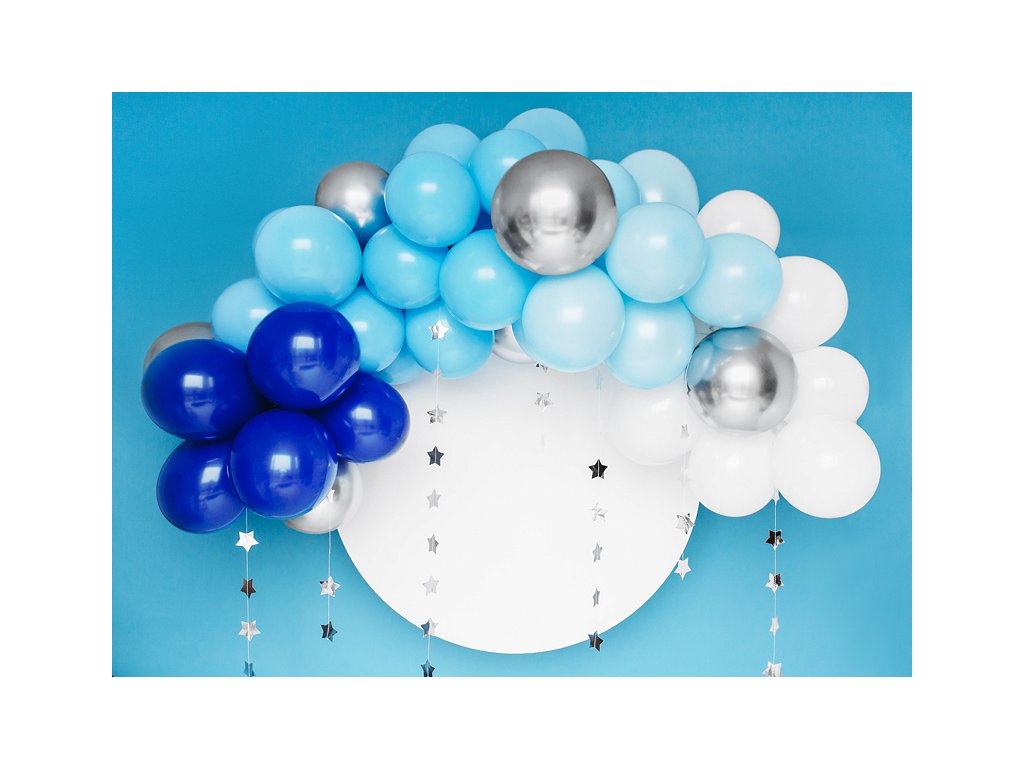 - obsah: 60 ks balonů (10 x stříbrné, 10 x tmavomodré, 10 x světle modré, 10 x sky-blue, 13 x bílé), 1 x průsvitná girlanda (2,5 m)