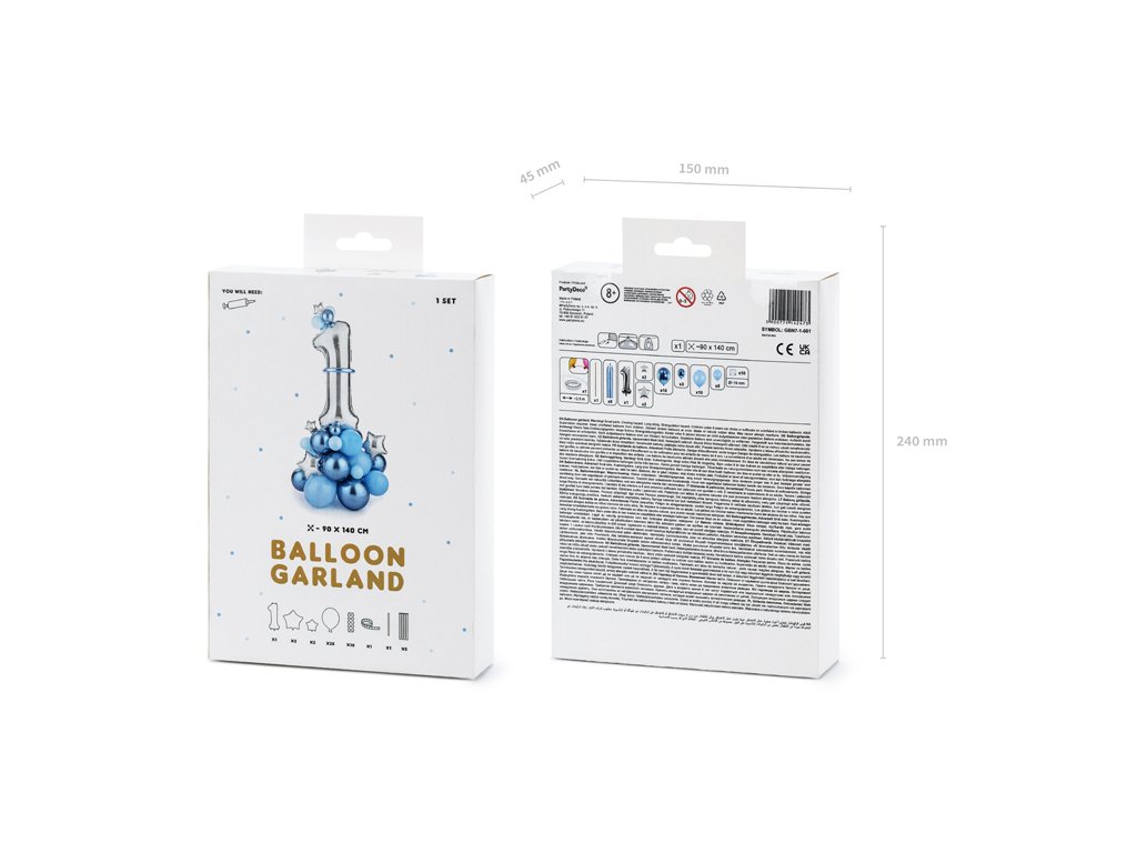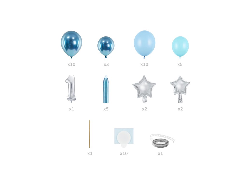 - obsahuje: 28 x balóny (pastelové modré a chromové modré), 10 x pěnová páska, 5 x tvarovací balóny, 1 x fóliový balón č.1, 4 x fóliové balóny hvězdy, 1 x brčka, 1 x balónová girlanda