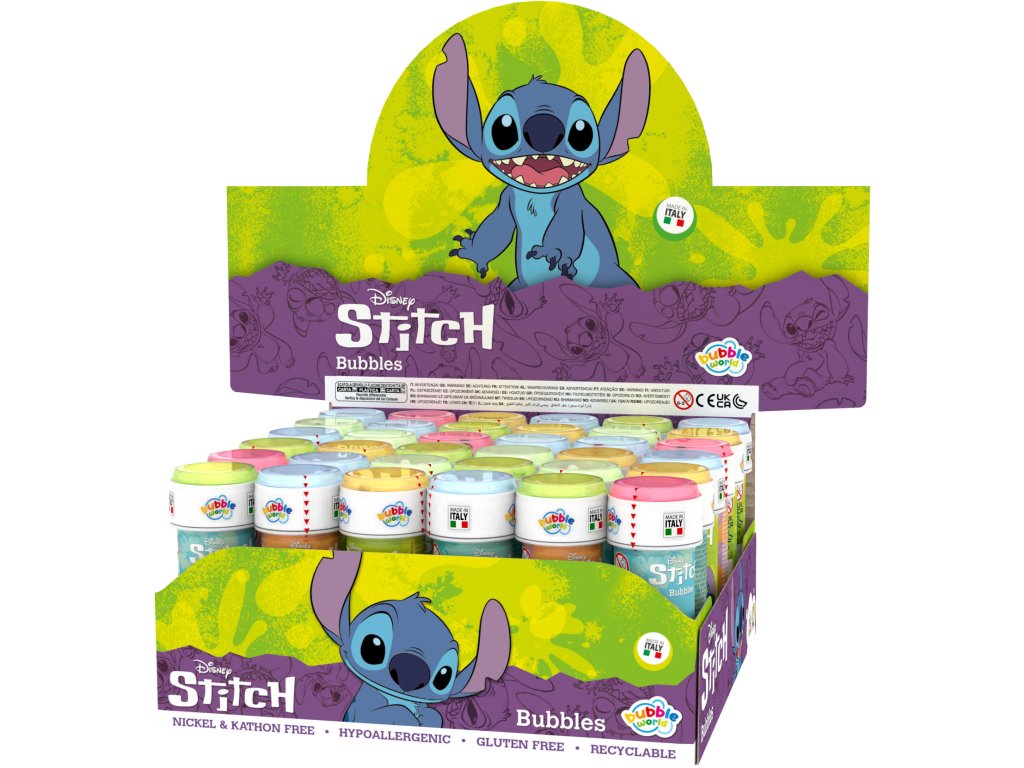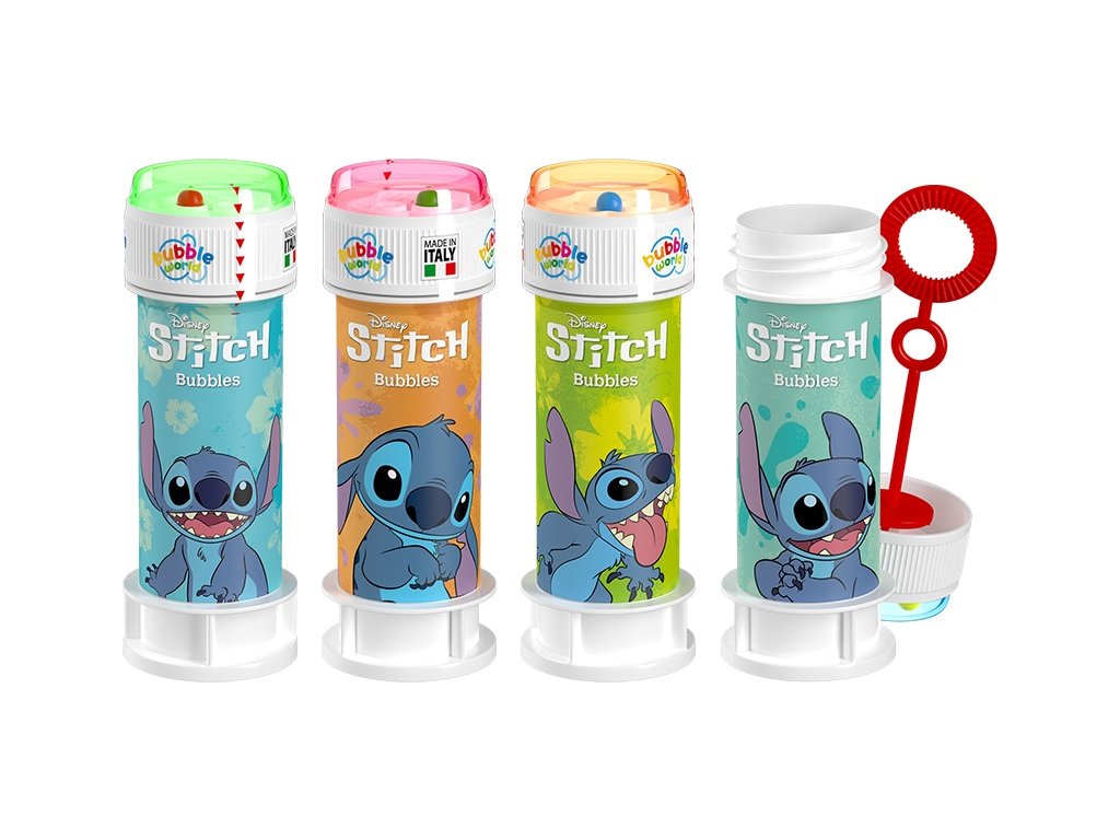 Veselý bublifuk s motívom Stitch. Stačí fúknuť a vyčaríte množstvo trblietavých bubliniek! Balenie 60 ml s praktickou paličkou. Vhodné pre deti od 3 rokov.