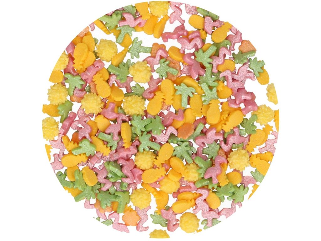 Jedlou posypovou dekoraci v tropickém motivu můžete použít k posypání cupcakes, cake pops, zmrlin, dortů a dalších zákusků. Výborně se hodí při dekorování letních svěžích dortů a dezertů.