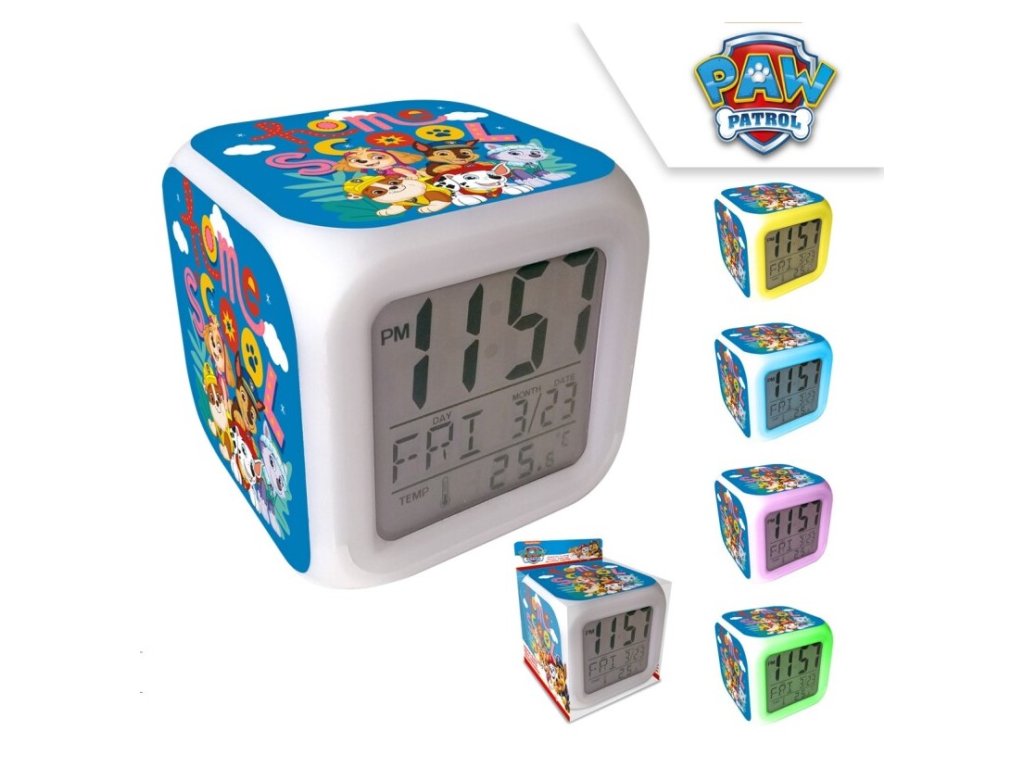 Budík představuje originální a praktický doplněk každého dětského pokoje. Svým designem potěší každého fanouška pohádky Paw Patrol, hodiny zároveň zobrazují teplotu, datum a lze měnit jejich barvu.
