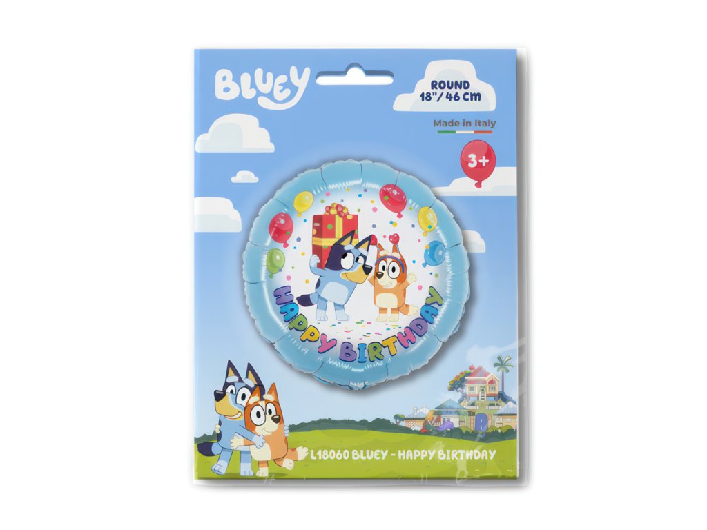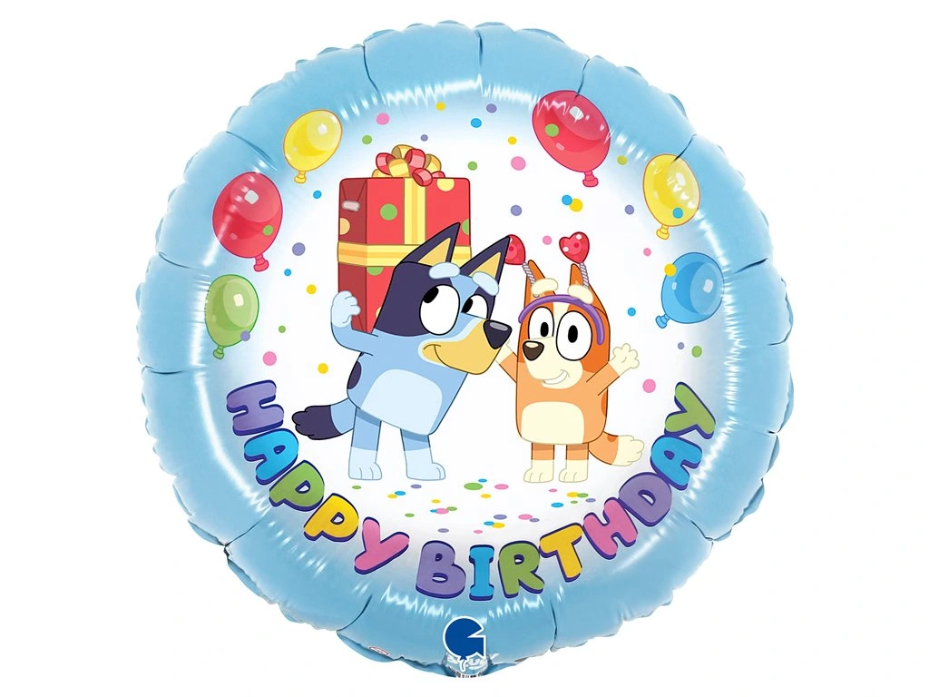 Oslavte narozeniny stylově s tímto úžasným fóliovým balónkem Happy Birthday s motivem Bluey! Tento barevný balónek s průměrem 46 cm rozzáří každou párty a vykouzlí úsměv na tváři malým i velkým fanouškům oblíbeného pejska Bluey.