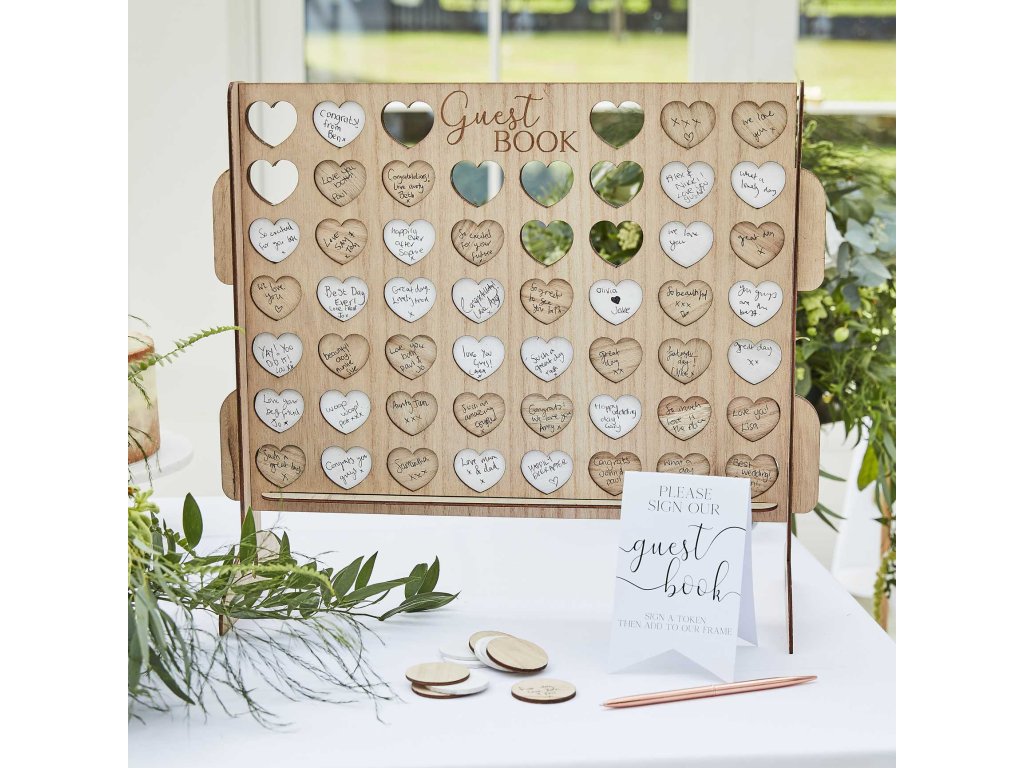 Svatební dřevěná kniha obsahuje 56 srdíček, z nichž 28 je v bílé barvě a 28 v barvě přírodního dřeva. Kniha návštěv lze snadno sestavit se všemi dodanými prvky, jednoduše požádejte hosty, aby podepsali žeton a vložili ho do čtvercového držáku v řadě.