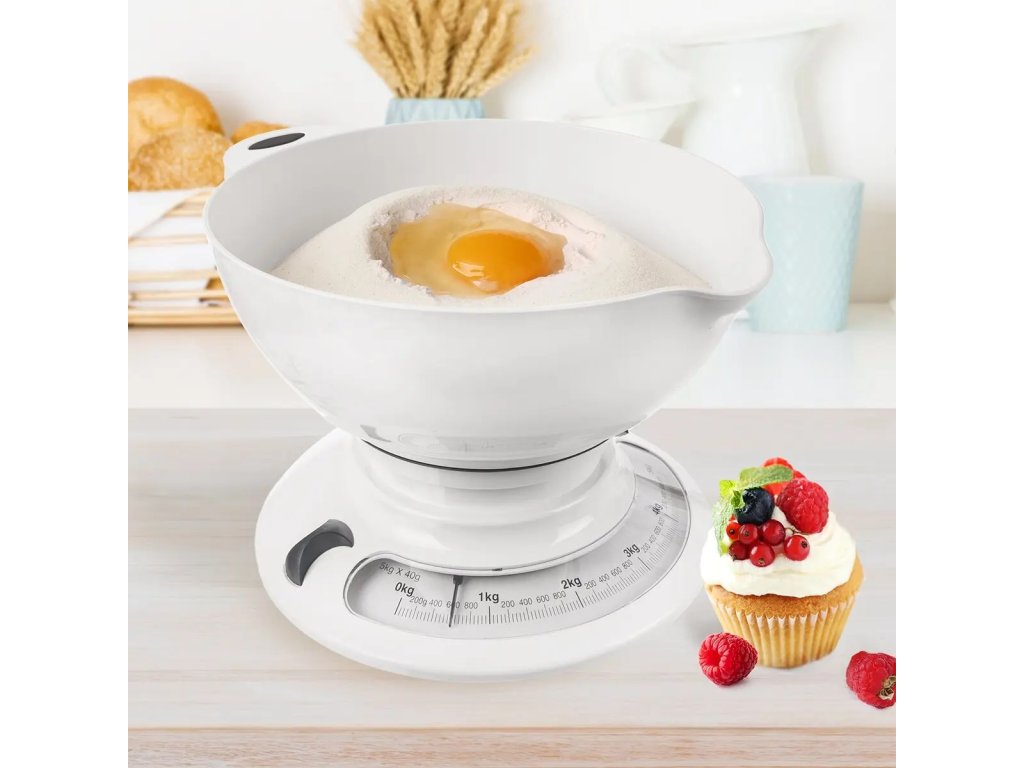 Praktická mechanická váha s nosností do 5 kg je ideálním pomocníkem při pečení, vaření i zavařování. Disponuje přehlednou stupnicí (1 dílek = 40 g) a možností dovažování jednoduchým otočením podstavce. Odnímatelná plastová miska s výlevkou (objem 2,7 l) je vybavena protiskluzovou gumou, stejně jako samotná váha, což zaručuje stabilitu při používání. Váha nevyžaduje baterie a je vyrobena z odolných materiálů.