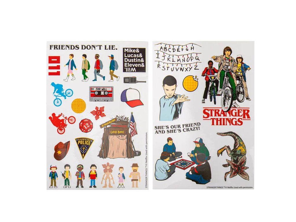 Vstup do světa Hawkinsu a ozdob si vše, co ti přijde pod ruku, těmito parádními nálepkami ze Stranger Things! Jedenáctka, Demogorgon, vafle i světýlka – vše, co miluješ na první sérii, nyní můžeš mít na notebooku, mobilu nebo sešitě. Ideální dárek pro každého fanouška, který chce ukázat, že Upside Down je jeho druhý domov. Přilep si kousek dobrodružství, záhad a přátelství kamkoli jen chceš - a možná se ti podaří otevřít i vlastní portál do jiného světa!