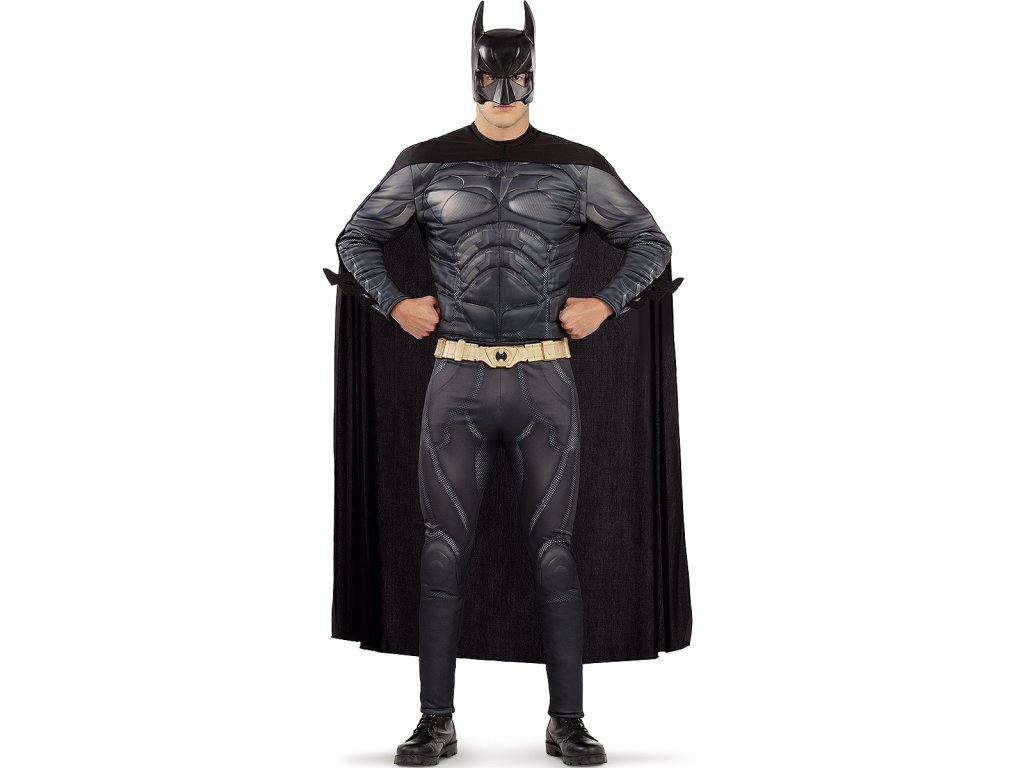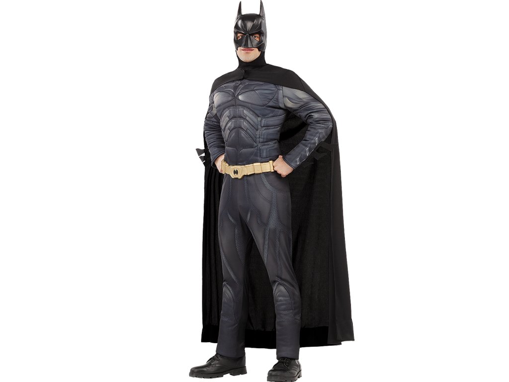 pohodlnou kombinézu, stylový pásek na všechny vaše netopýří gadgety, pevnou polomasku, která skryje vaši tajnou identitu a extra velký plášť, který vám dodá dramatický efekt při každém otočení!