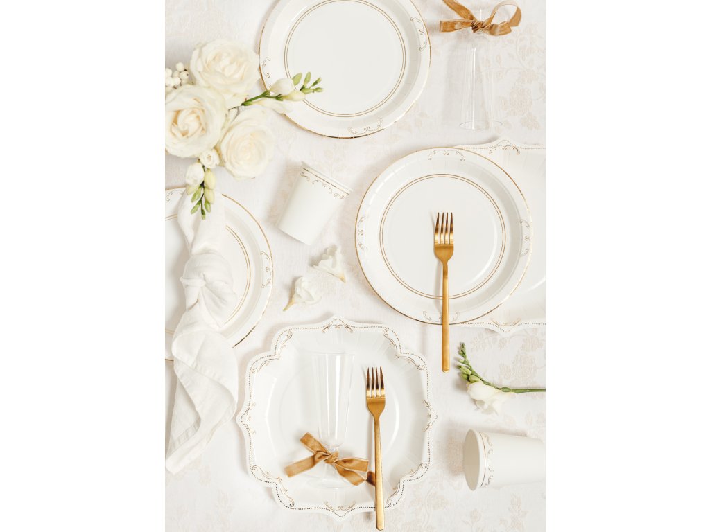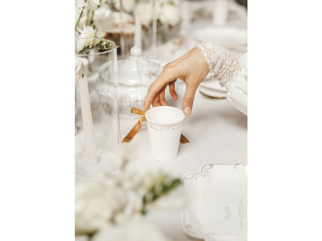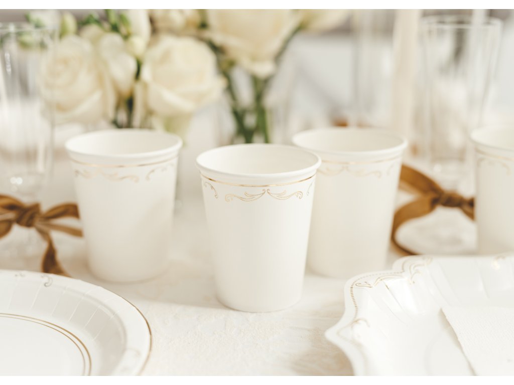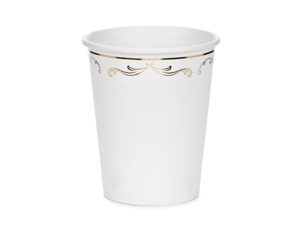Elegantní papírové kelímky v bílé barvě se zlatým ornamentem jsou ideální na studené nápoje během oslav, party nebo narozeninových akcí. Kelímky jsou určeny na jednorázové použití a nejsou vhodné pro horké nápoje.