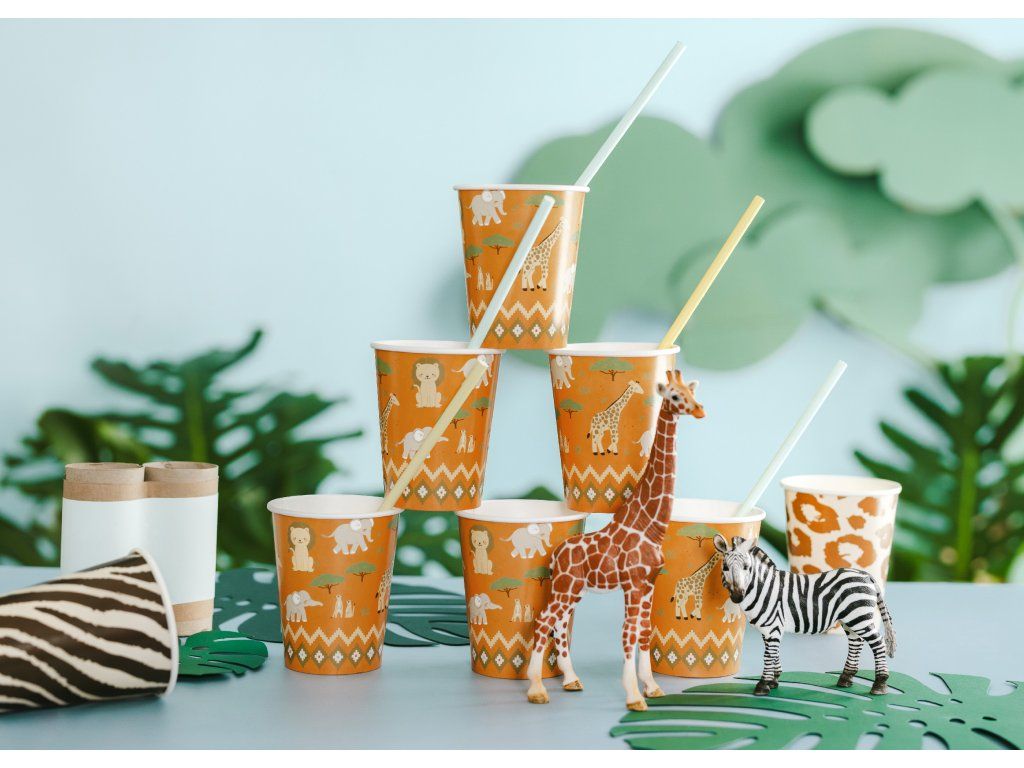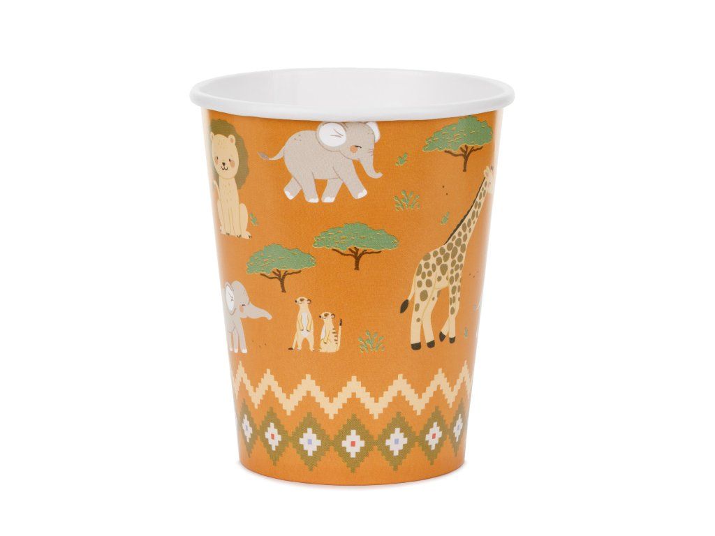 Tyto Safari kelímky jsou jednorázové papírové kelímky v oranžovém provedení s veselým potištěným motivem. Jsou vhodné pro různé příležitosti, jako jsou oslavy, párty nebo pikniky, a jsou určeny k servírování studených nápojů. Produkt není vhodný na horké nápoje a je určen pro jednorázové použití.