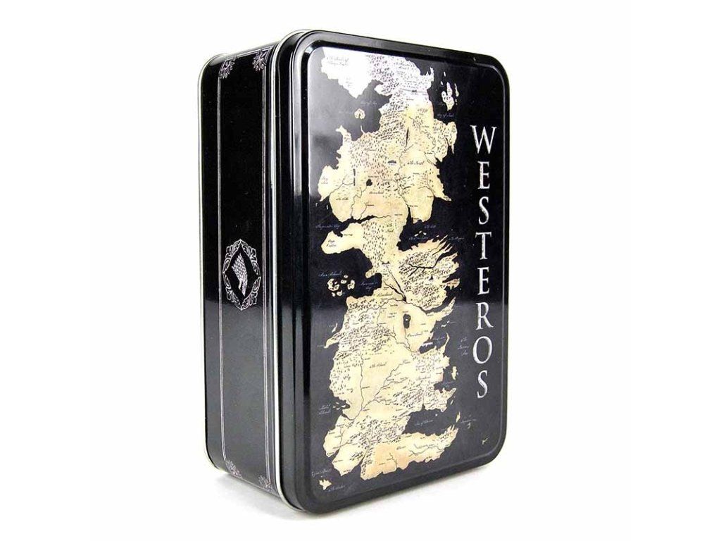 Kovová krabička na oběd či jiné důležité věci, jako jsou např. zlaté dračí mince. Krabičku zdobí mapa Západozemí z oblíbené fantasy série Game of Thrones - Hra o trůny.