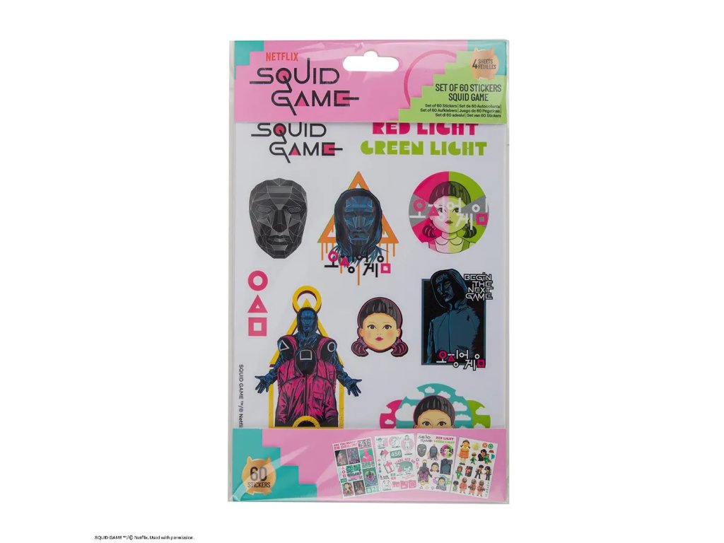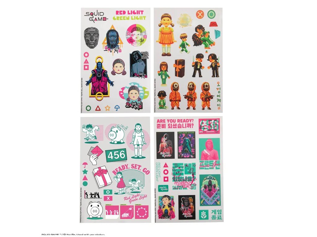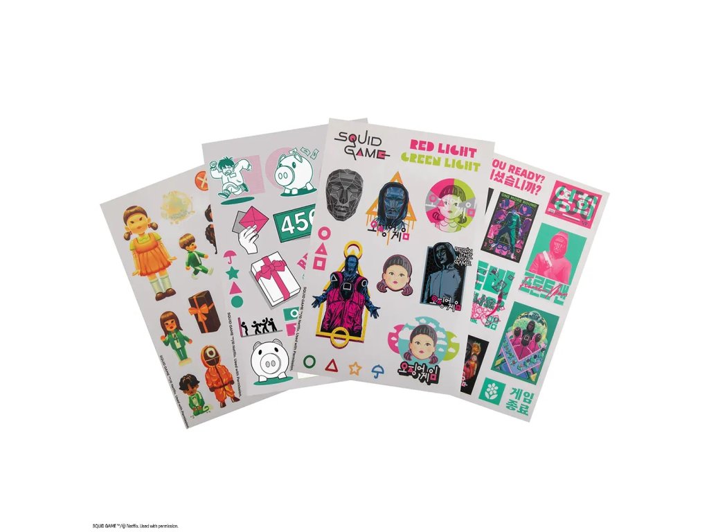 Sada samolepek Squid Game je skvělým dárkem pro všechny milovníky seriálu a ty, kteří chtějí svůj každodenní život trochu okořenit. Není však vhodná na lepení na citlivé povrchy nebo na místa, kde byste samolepku později nechtěli odstranit – přece jen, ne každý chce mít Squid Game i na ledničce v práci!