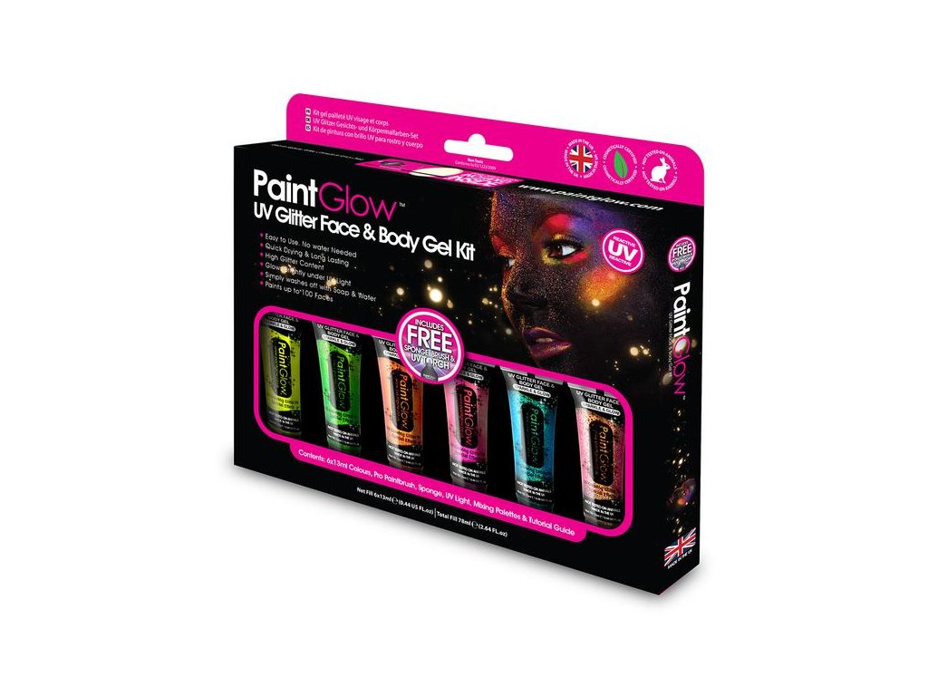 Chcete si vytvořit třpytivý a UV zářivý make up na party? Vyzkoušejte tento set GLITROVÉ gelů i se houbou a štětcem na jednodušší nanesení na tělo nebo obličej. Set obsahuje 6 GLITROVÉ gelů v různých barvách, které jsou UV reaktivní a s nimiž si vytvoříte jedinečný make up. GLITROVÉ gely jsou vhodné na malování na obličej nebo tělo. Jsou dermatologicky testovány a proto se nemusíte bát o svou pokožku. Výrobky jsou vyrobeny ve Velké Británii.