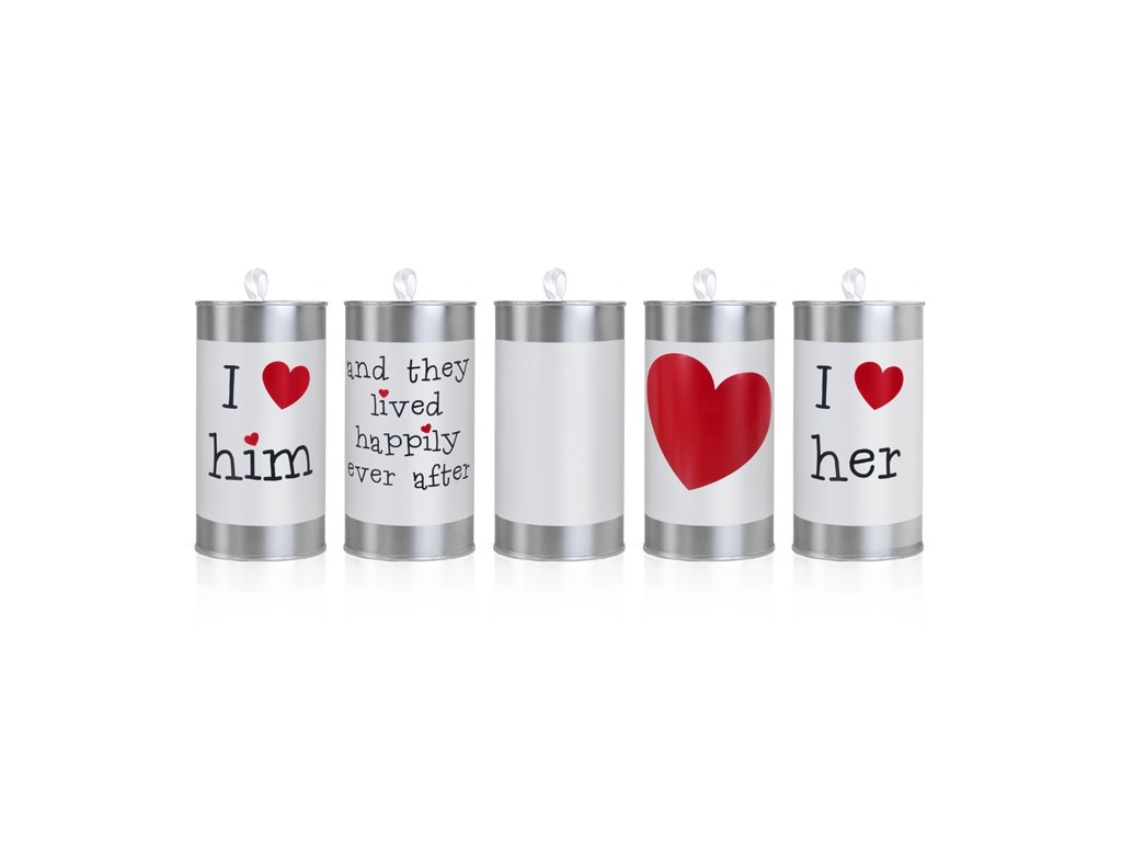 - počet: 5 ks plechovek s bílými stuhami