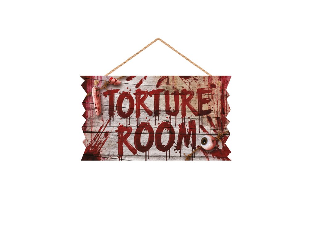 Vytvořte nezapomenutelnou halloweenskou party s pomocí různých strašidelných dekorací. Skvělým halloweenským doplňkem je i tato tabulka na dveře s nápisem „Torture room“, která se hodí k vytvoření strašidelné atmosféry pro každou oslavu.