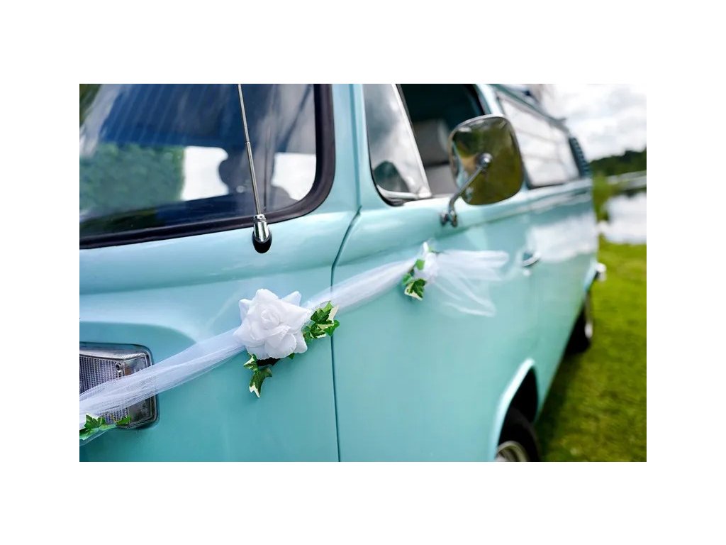 Každý detail svatební oslavy je důležitý a právě proto si zaslouží i Vaše svatební auto tu nejkrásnější výzdobu. S touto tylovou girlandou s bílými růžemi a zelenými lístky, se Vaše auto stane nejen prostředkem dopravy, ale skutečným symbolickým klenotem Vašeho velkého dne. Buďte středem pozornosti na cestách a okouzlete každého kolemjdoucího touto výzdobou.