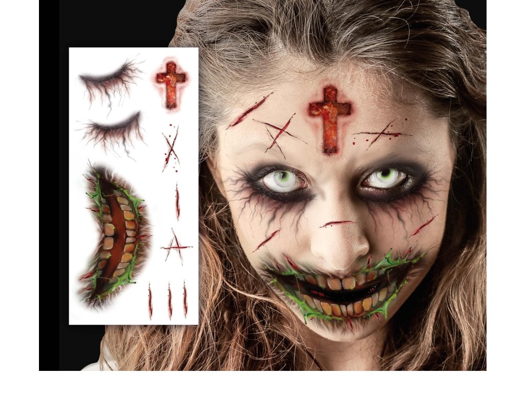 Zombie tetování na obličej je ideálním doplňkem pro ty, kteří chtějí rychle a jednoduše dosáhnout autentický zombie vzhled bez potřeby složitých technik líčení. Tato dočasná tetování jsou navržena tak, aby reprodukovala realistický vzhled zombie kůže, včetně detailů, jako jsou krvavé rány, skvrny a modřiny, které přidávají na hrůzostrašné atmosféře.